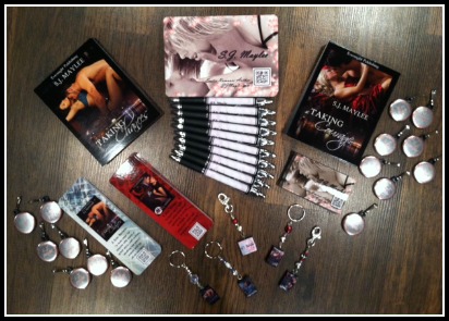 * My blog prize: the first prize: $10 Amazon Gift Card the second prize: swag pack (US only and includes one of each item in the picture below and your choice of book charm – if someone outside the US wins they’ll receive an ecopy of one of my released books)